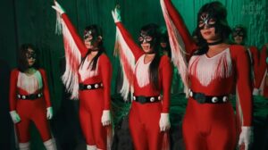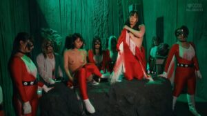 今回の女戦闘員たちの掛け声は「シャー」。元ネタは「仮面ライダーアマゾン」に登場する赤ジューシャ。男ヒーローは劇中に存在するがちょっと怪人的なデザインでおかしいなと思ったが、それは仮面ライダーアマゾンが元ネタだったからと感じた。仮面ライダー系は版権が厳しくそれっぽいデザインのは過去にお蔵入りしている模様。それにより一人特撮ヒーローものってデザインが難しいですよね。どうしても、仮面ライダーが代名詞で思い浮かんじゃいますし。